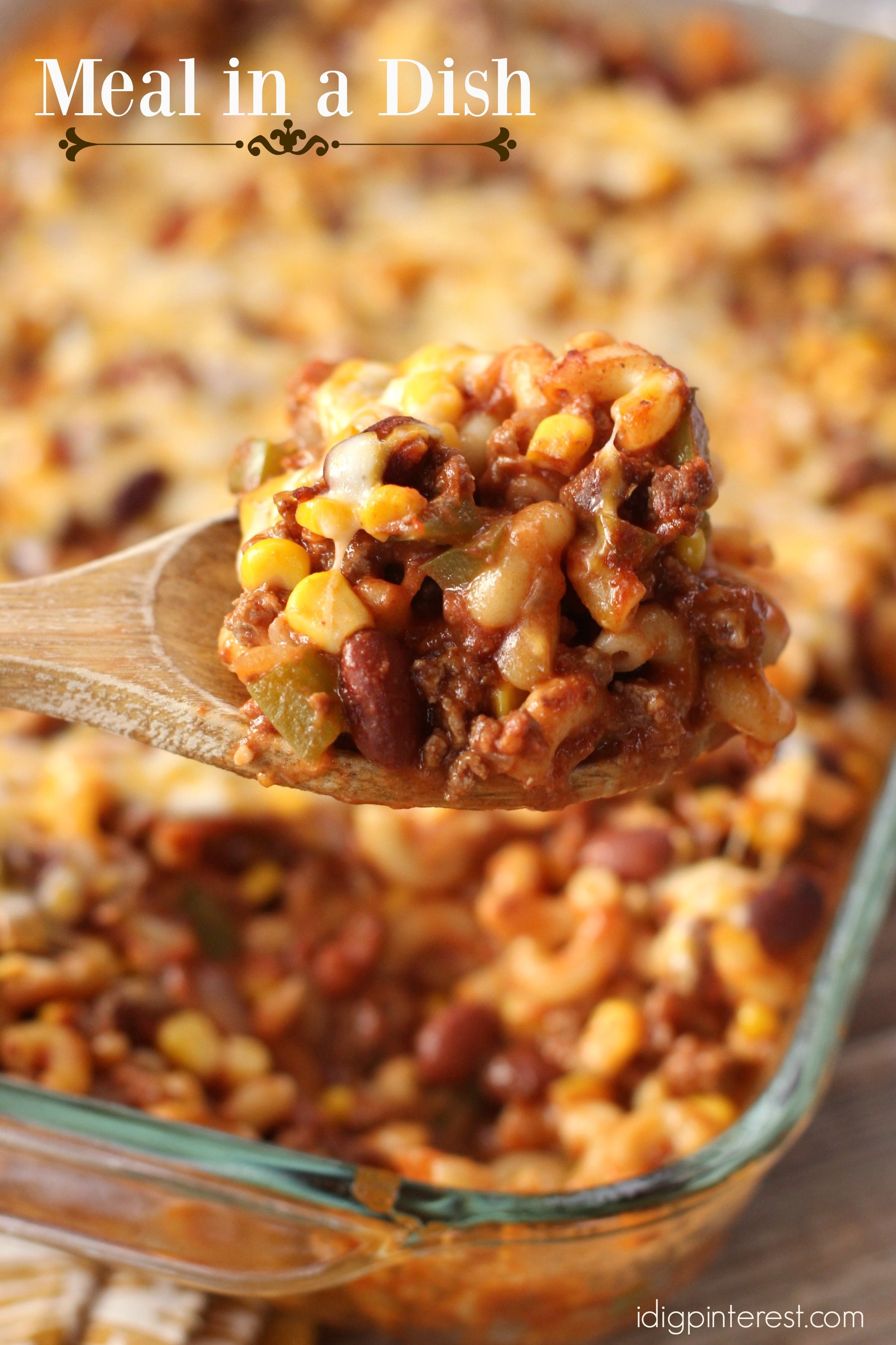 This comforting chili macaroni casserole, packed with pasta, beef, beans and corn, then topped with oodles of melty cheese is sure to become a family favorite!