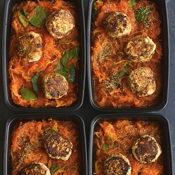 Meal Prep Spaghetti Squash & Meatballs! A traditional recipe gets a low carb swap & pair with veggie loaded meatballs for a high protein lunch or dinner! Paleo + Gluten Free + Low Calorie