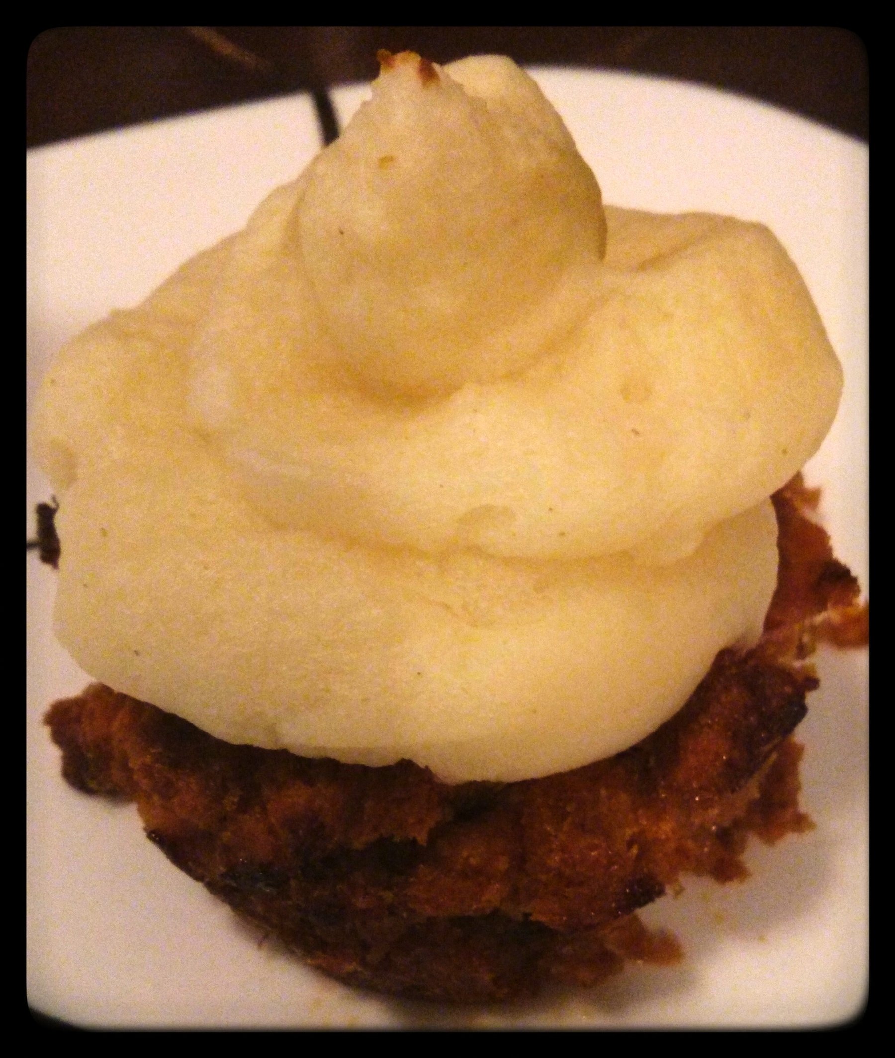 Meatloaf baked in a cupcake pan, "frosted" with mashed potatoes.