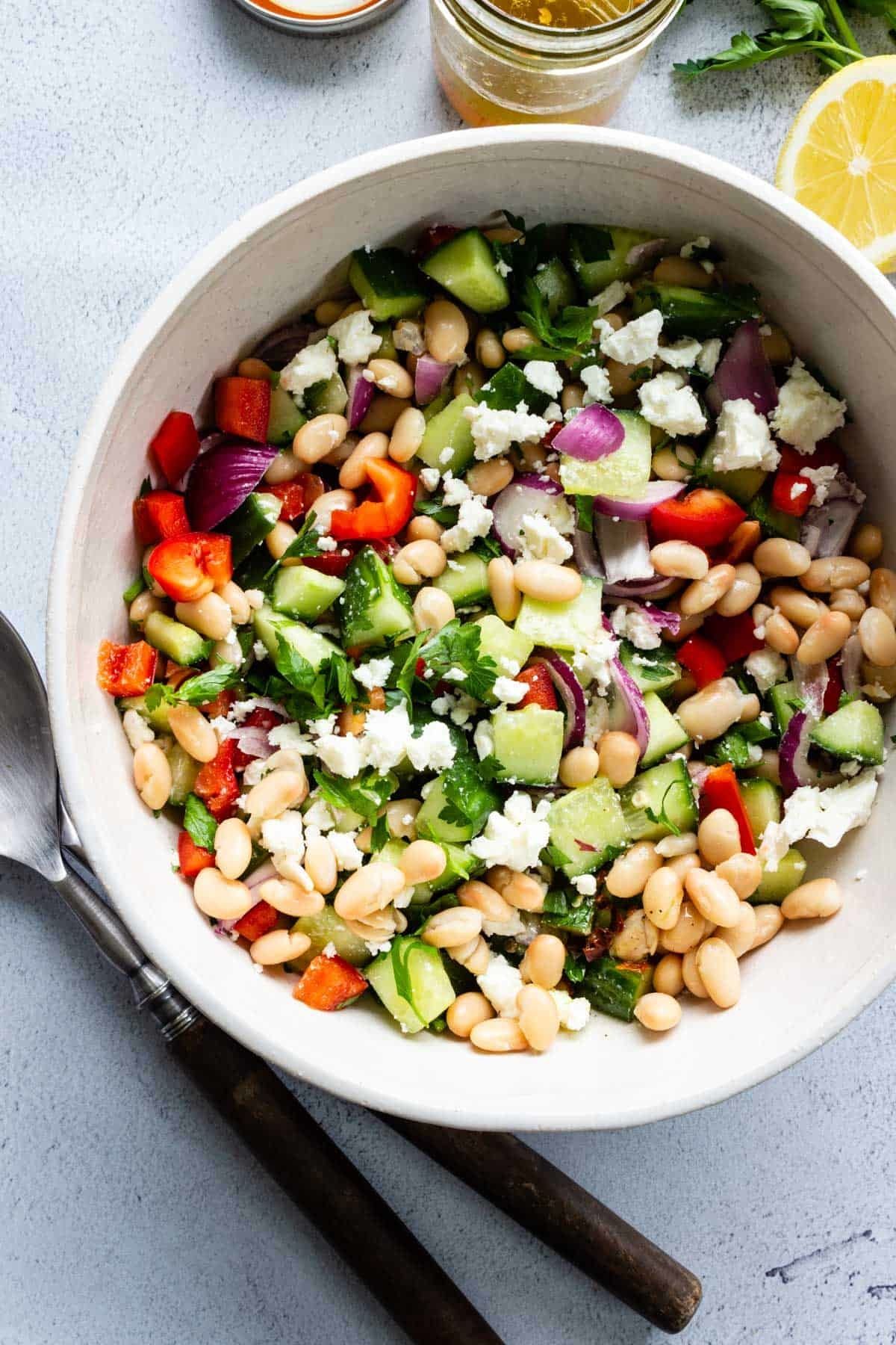 Mediterranean Bean Salad PassMeSomeTastyApril 29, 2020 125 www.passmesometasty.comA satisfying salad perfect for lunch or outdoor bbqs and picnics. This salad also serves as a tasty side dish with grilled chicken, shrimp, or fish. Serves 6Try itSee the full directions on my site