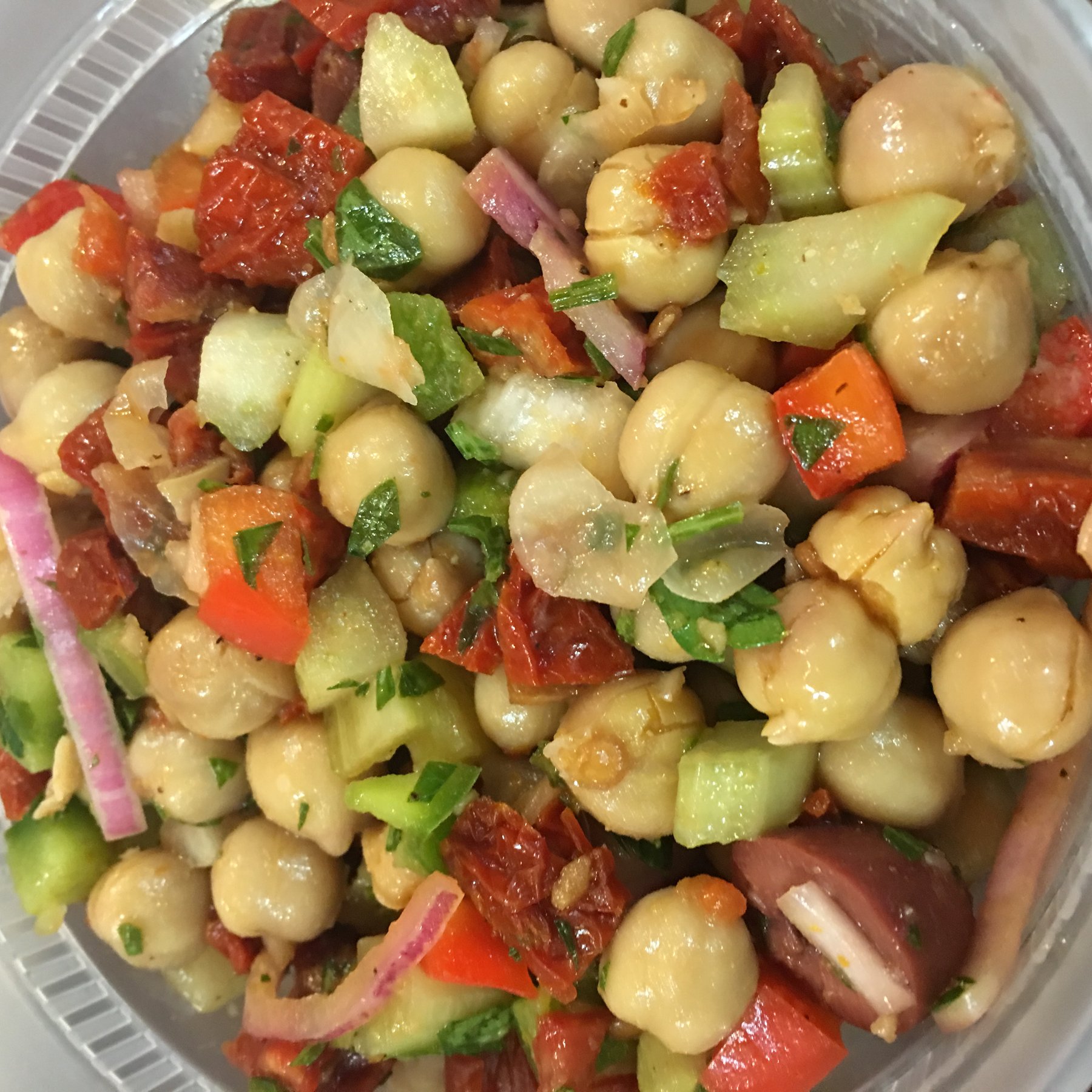 Mix all ingredients (Sun dried tomato, chickpea, parsley, red bell pepper, olive, red onion and cucumber) in a mixing bowl