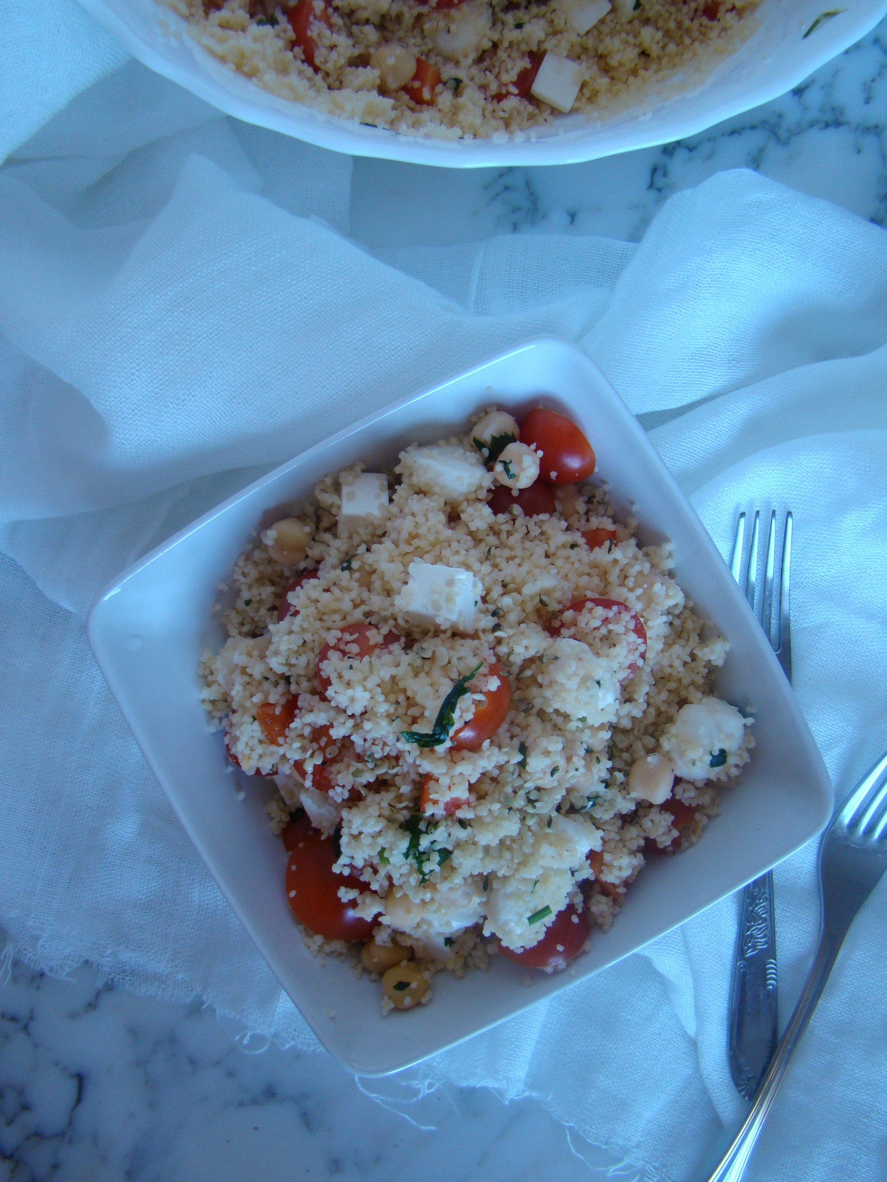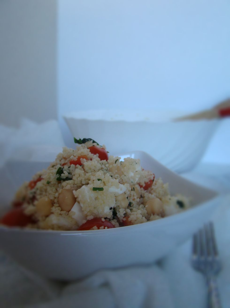 In a bowl add the couscous, salt, pepper, parsley and the oil. Boil 300 ml of water and pour it over the couscous. Cover the bowl with a lid and set apart for 10 minutes. In a bigger bowl, add the rest of...