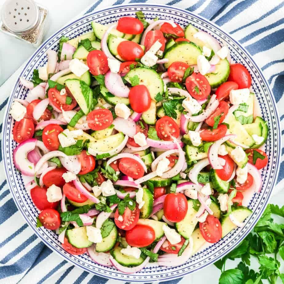 Mediterranean Cucumber Tomato Salad OnMyKidsPlateJuly 01, 2022 54 Packed full of fresh flavors, this Mediterranean cucumber salad makes a quick, easy and delicious side for any table. Juicy tomatoes, fresh cucumbers, and fresh herbs are all topped with a tangy dressing that can be on the table fast!Find the full recipe on my site!See the full directions on my site