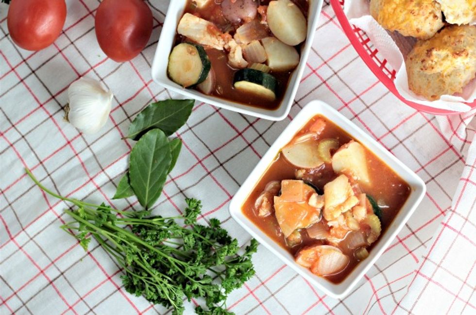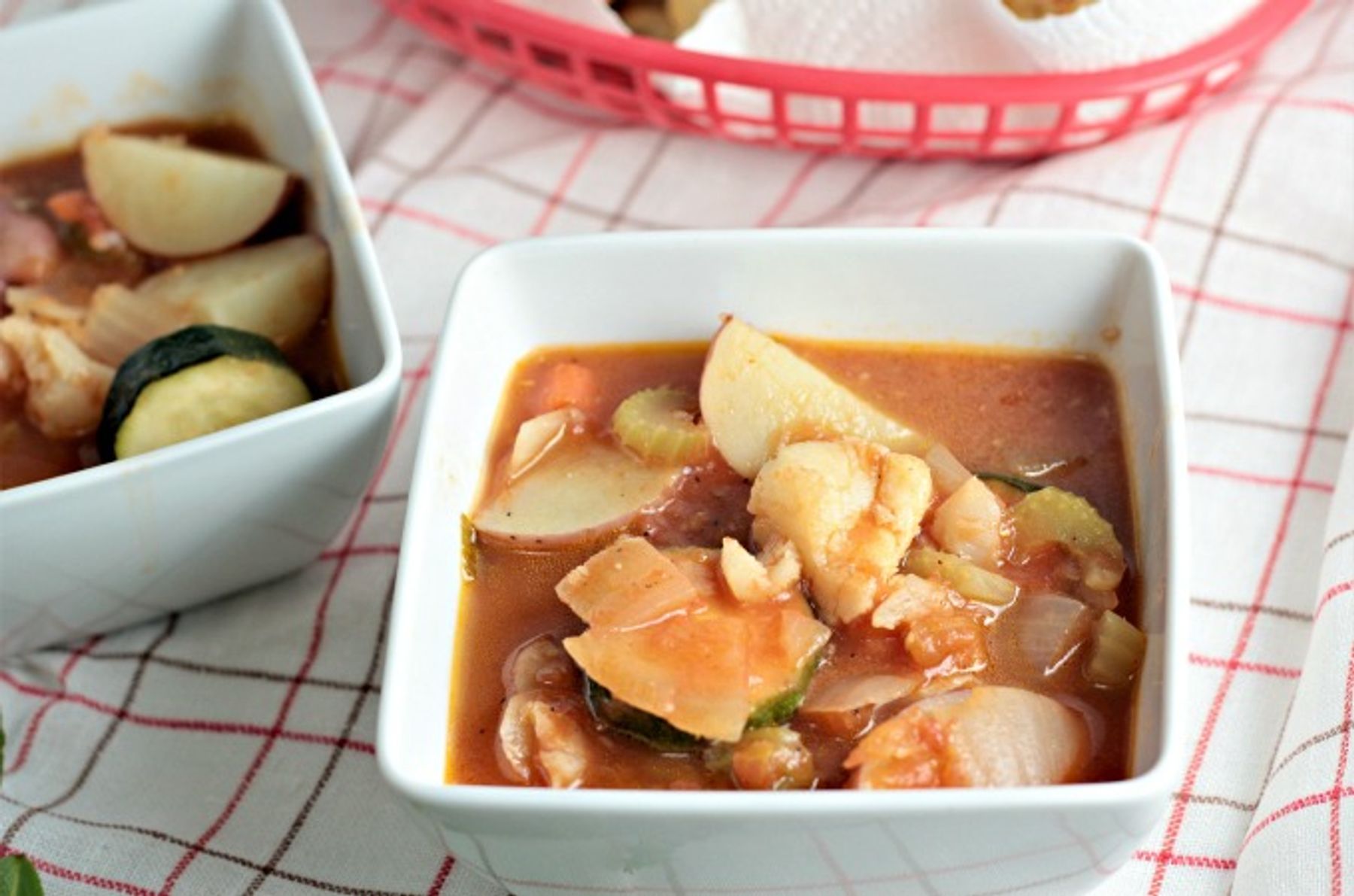 Mediterranean Fish Stew features cod, potatoes, tomatoes, carrots, celery, onions, garlic, anchovies, and fresh herbs. It is a flavorful and healthy dish.