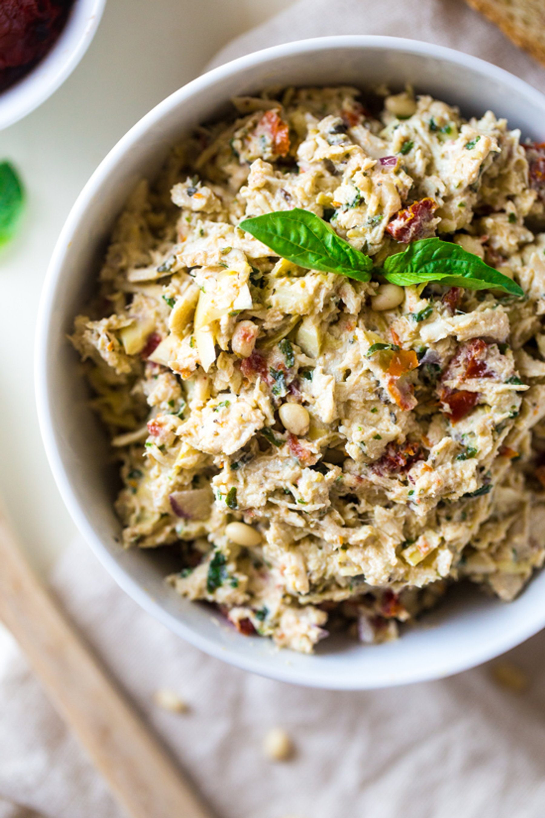 This creamy Chicken Salad with Greek yogurt is made with basil, artichokes, pine nuts and sun dried tomatoes for a quick and easy meal that is secretly healthy!