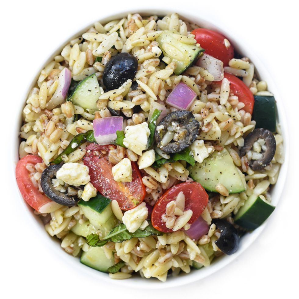 Bring a pot of salted water to a boil. Add in orzo and farro. Cook for 10 minutes until al dente. Allow to cool down after draining.
