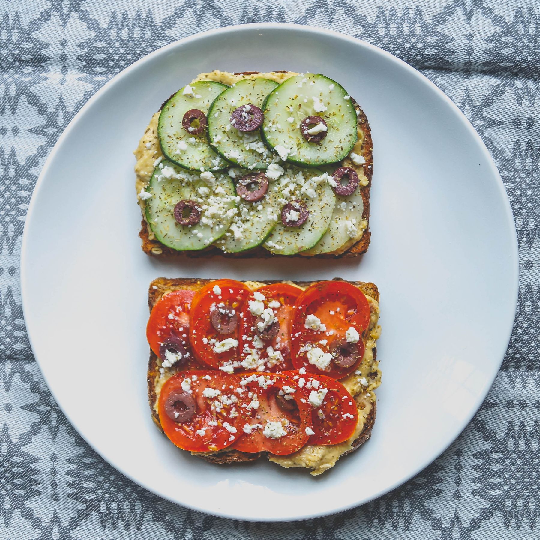 Slice tomatoes, olives, and cucumbers while toasting bread