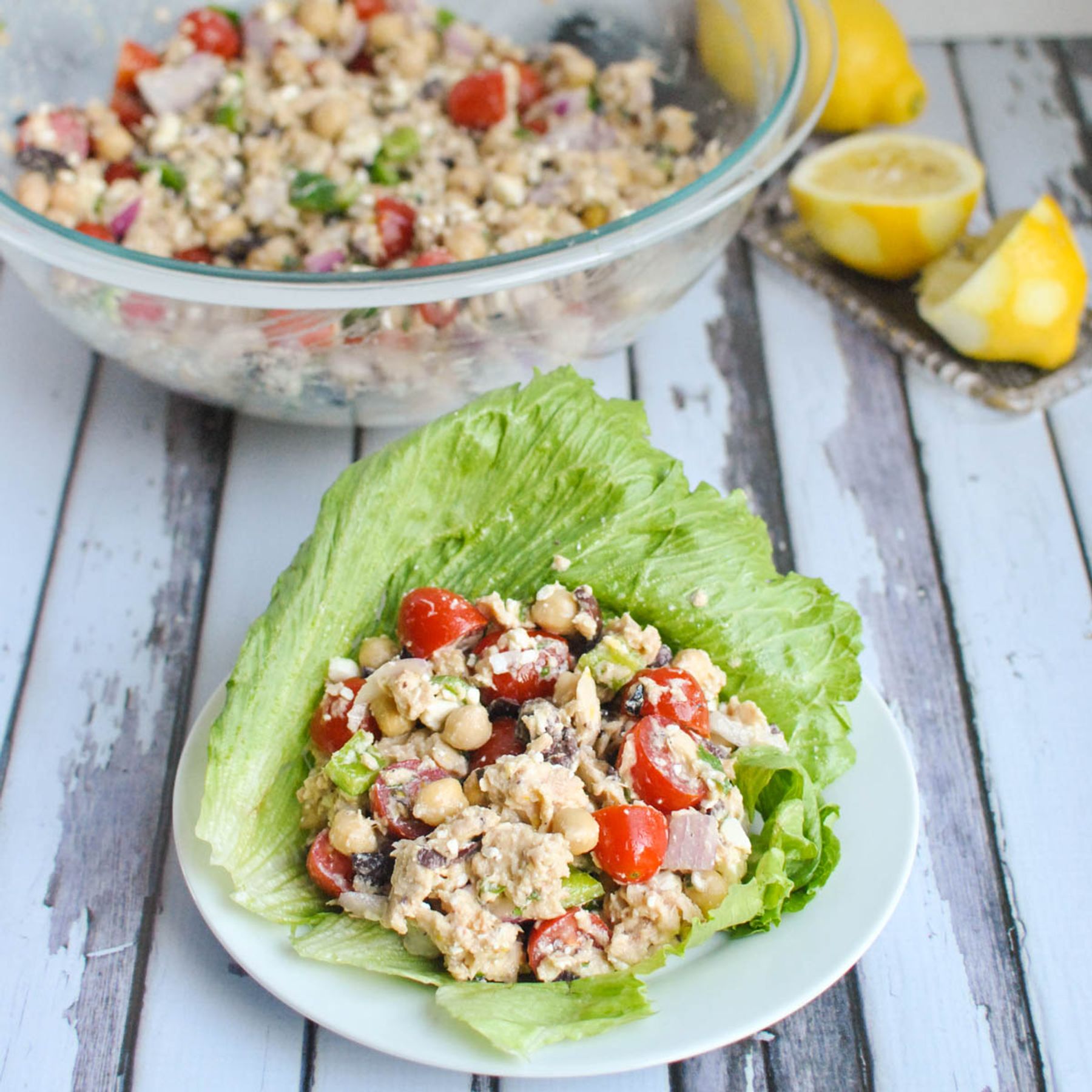 Main Dishes Mediterranean Tuna Lettuce Wraps Becky Brosemer September 02, 2015 60 Mediterranean Tuna Lettuce Wraps are a simple, healthy, no-cook dinner idea. Recipe features chickpeas, olives, feta cheese, tomatoes in a dijon lemon vinaigrette Diabetic-Friendly Shellfish Dairy-Free Gluten-Free Low-Sodium Greek Dinner Low-Fat Refrigerated High-Fiber Low-Carbohydrate Sugar Free