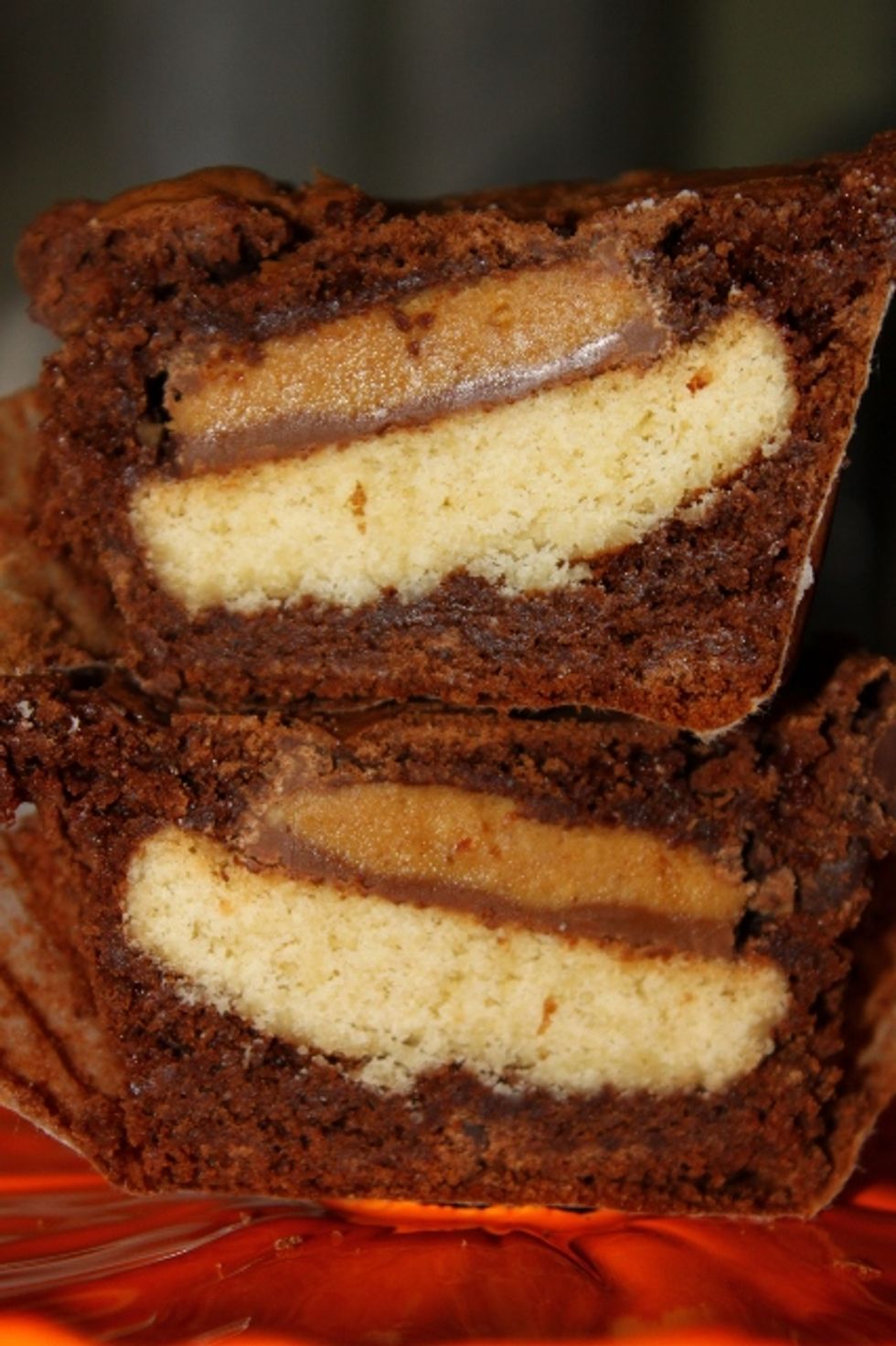 Brownies stuffed with peanut butter cups and shortbread cookies
