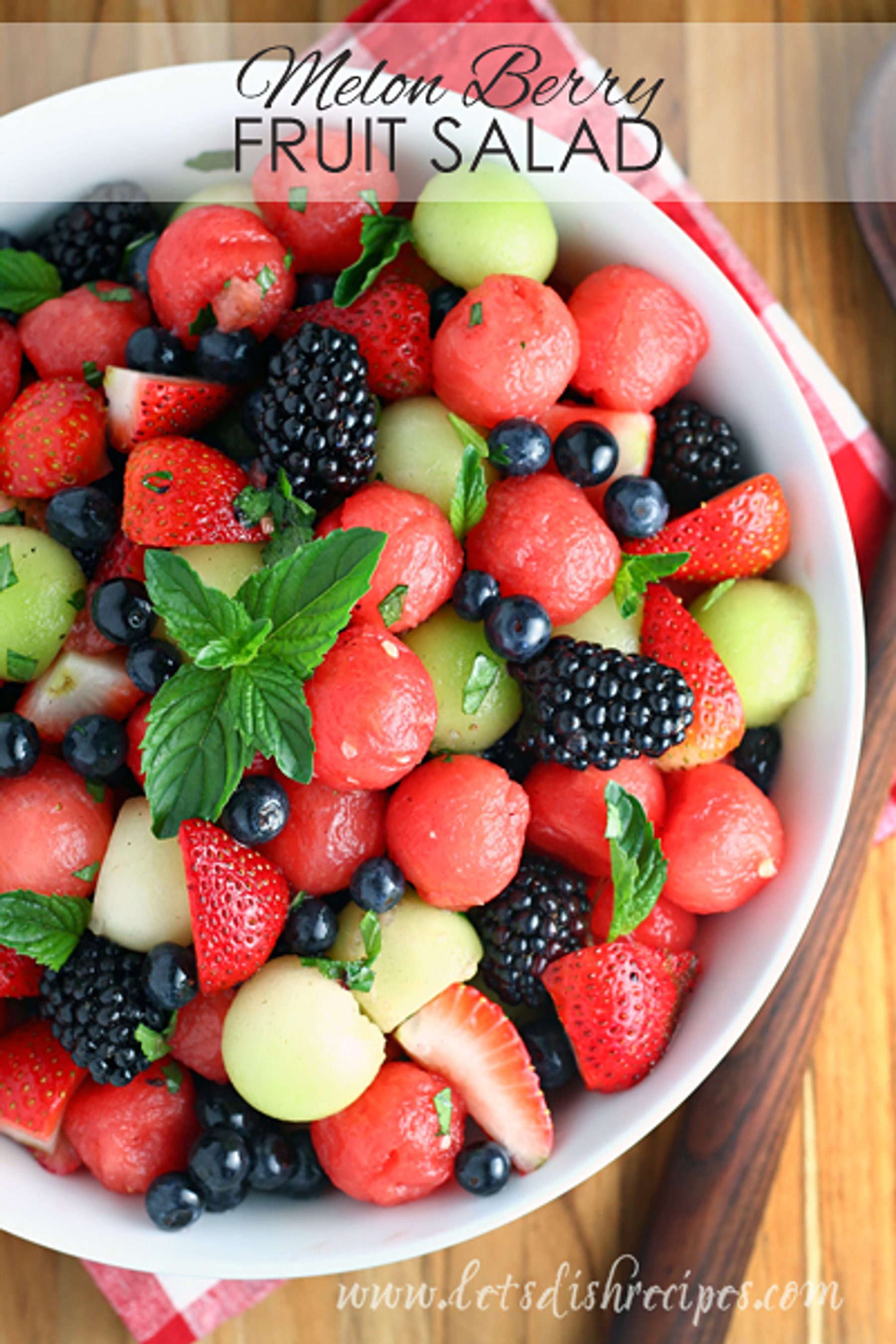 Watermelon, honeydew and berries are tossed in a honey lime dressing and garnished with fresh mint in this refreshing summer salad.