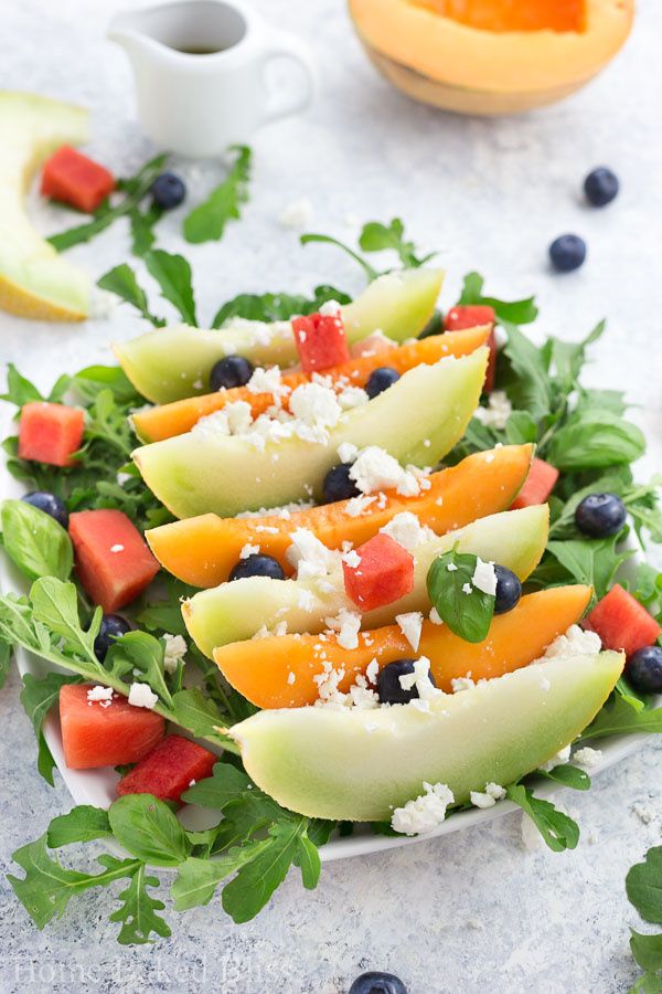 A refreshing and light summer salad composed of melons, watermelon, feta cheese and a drizzle of olive oil.