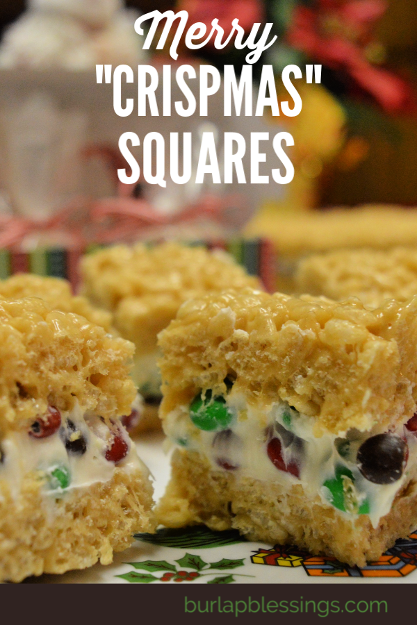 Vanilla frosting and red and green candy-coated chocolate pieces are sandwiched between two layers of peanut butter, marshmallow cereal squares.