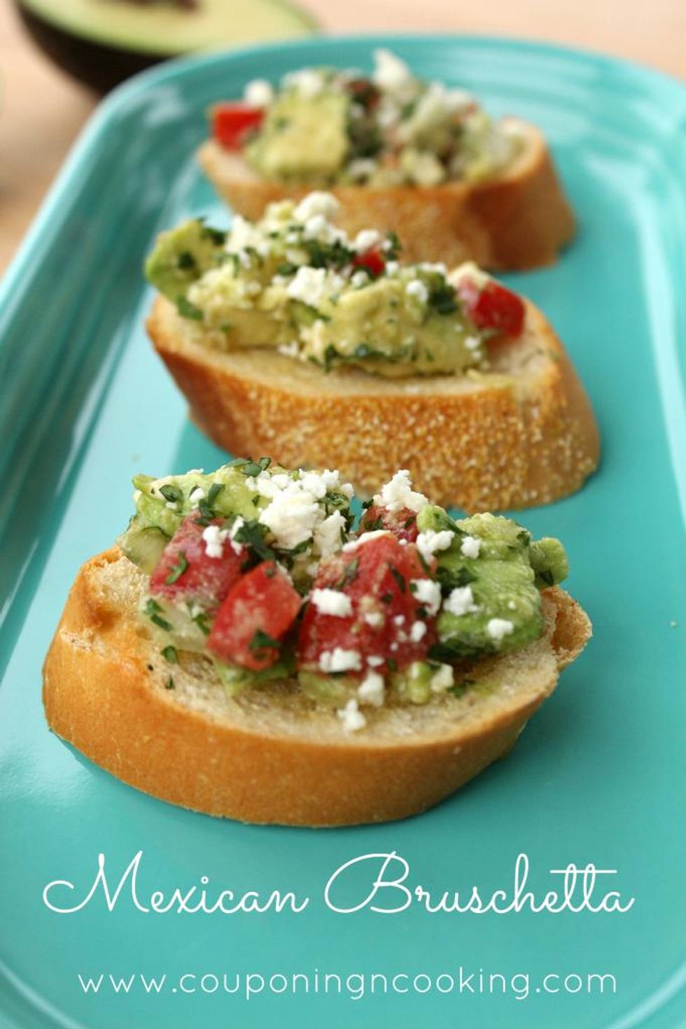 That's where this Mexican Bruschetta comes in. If a bistro married a cantina, this would be their baby. It's the perfect blend of avocados, tomatoes, onions and feta cheese atop a crispy slice of sourdough bread. The hint lime juice leaves you wishing you had a margarita.