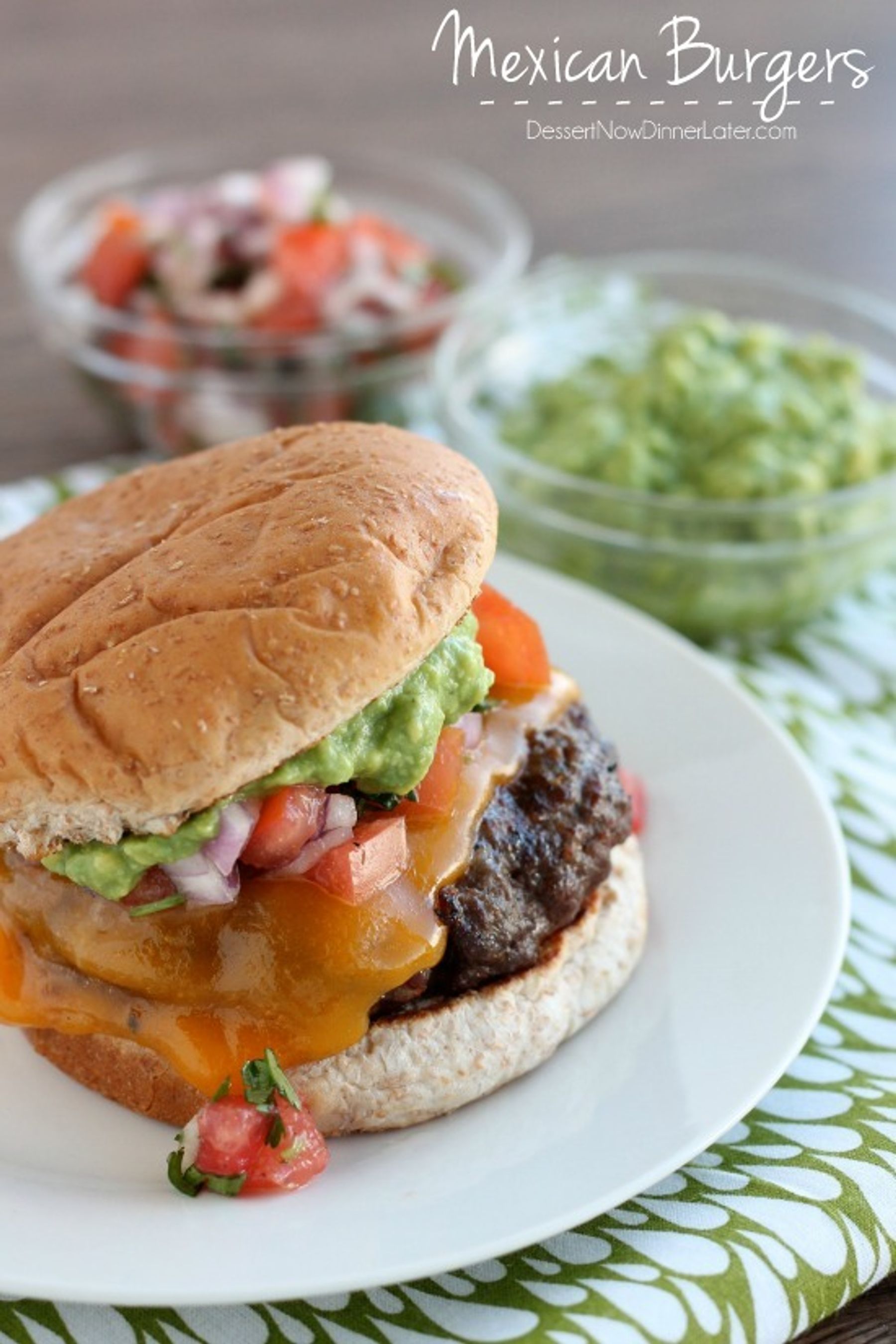 These Mexican Burgers are seasoned with taco mix and topped with cheese, guacamole and fresh pico de gallo for a flavor experience like none other.