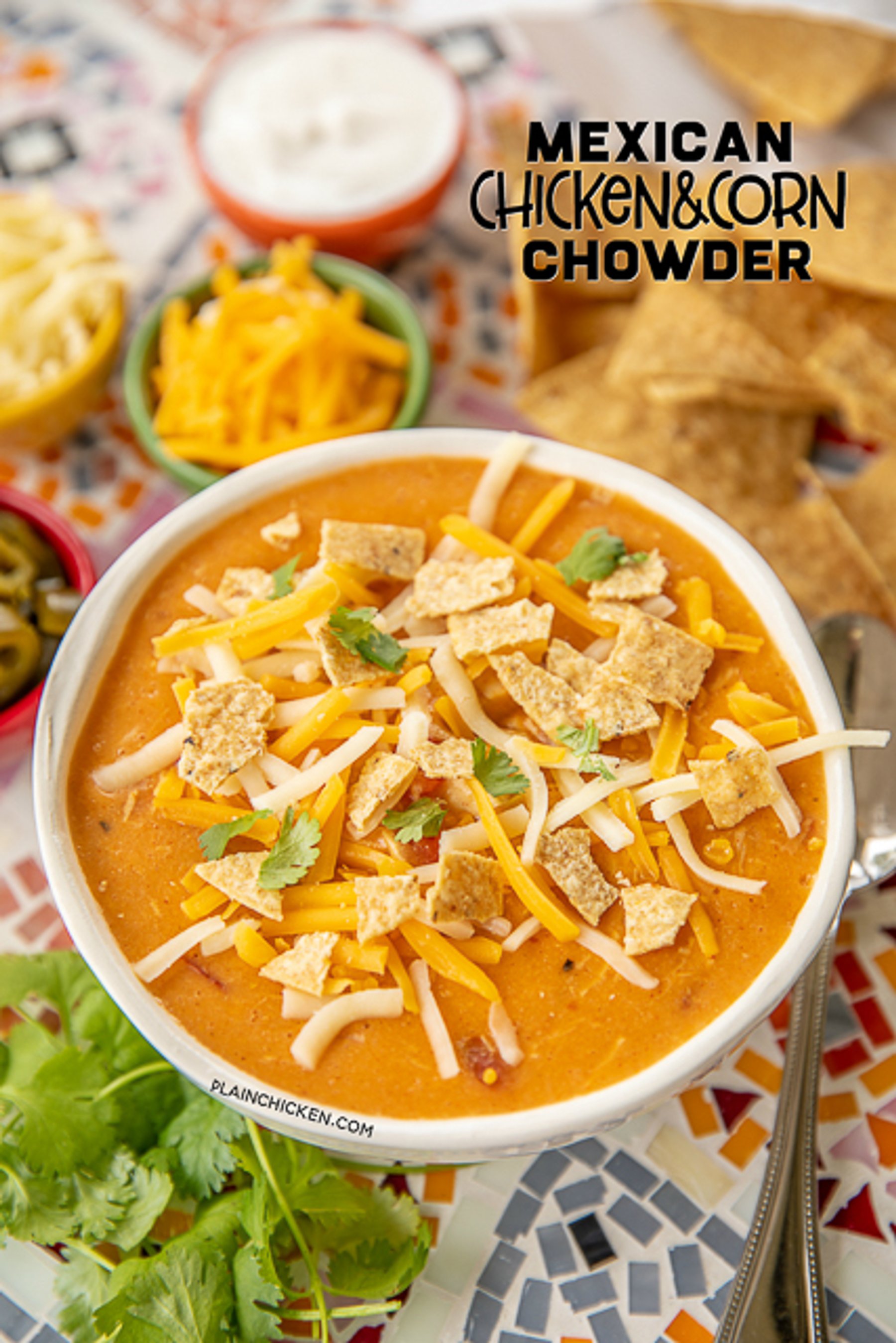 Mexican Chicken Corn Chowder - so simple and delicious!! Ready in about 30 minutes!! Chicken, creamed corn, diced tomatoes and green chiles, cumin, onion, garlic, chicken broth, half-and-half and cheese. SO creamy and delicious! Everyone went back for seconds. Such a quick and easy weeknight meal! #soup #chicken #mexican #30minutemeal #easydinner