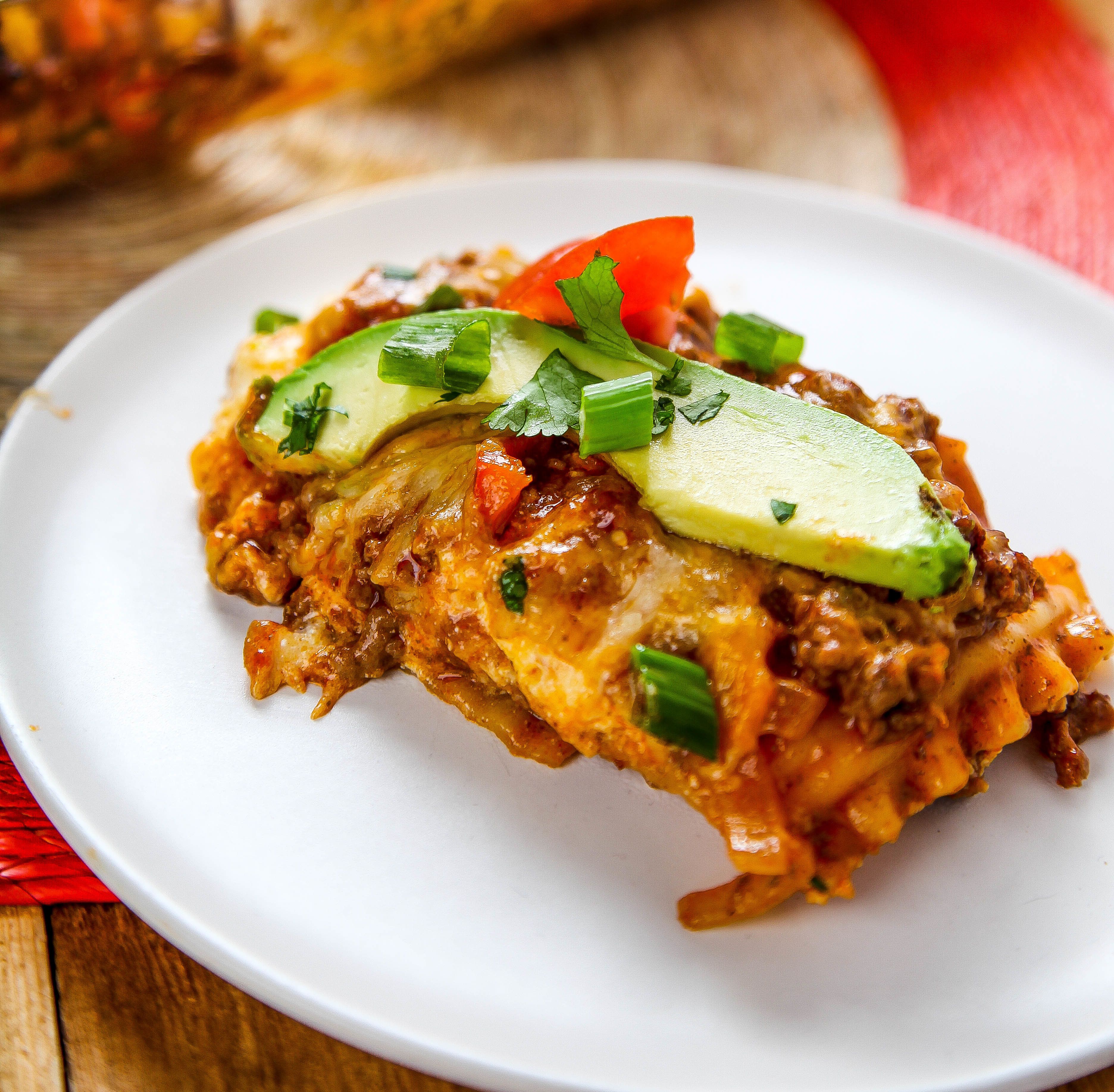 Mexican Lasagna: Saucy beef, and gooey cheese sandwiched between layers of noodles. Combine your 2 favorite cuisines in this easy comfort food.