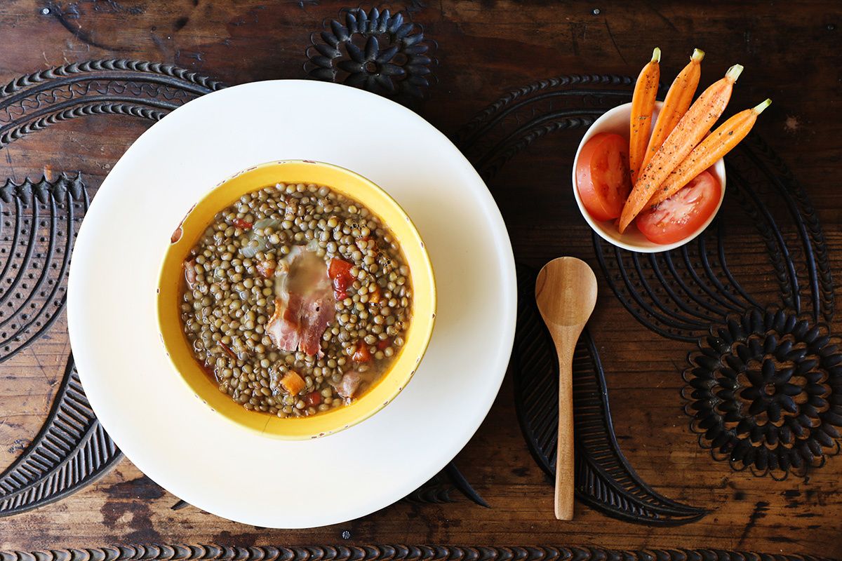 Mexican lentil soup prepared with sautéed onions, carrots, tomatoes, and bacon.
