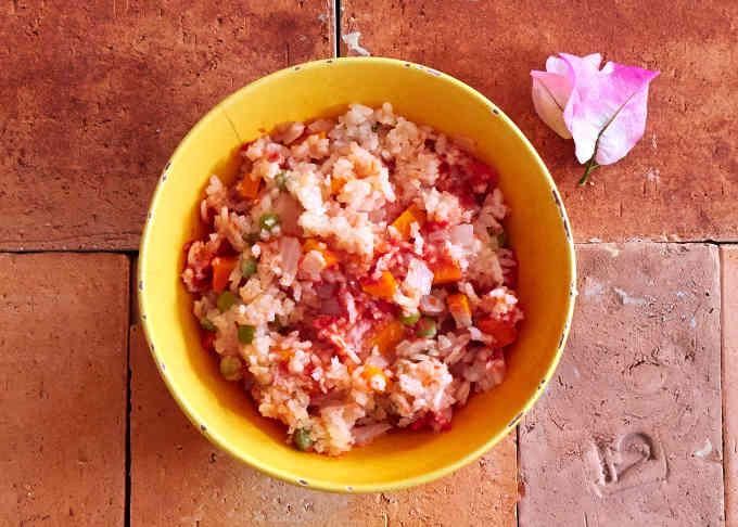 Rustic Mexican red rice made with plum tomatoes, onion, carrot and peas. An easy to prepare, delicious side dish for beef, chicken or enchiladas.