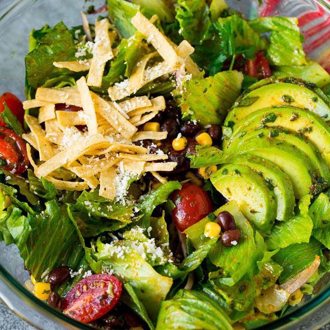 This Mexican salad is a blend of mixed greens, black beans, tomatoes, corn, avocado, cotija cheese and tortilla strips all tossed in a tangy lime dressing. The perfect salad to accompany any Mexican meal, or add grilled chicken to make it a main course!