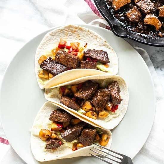 If you are looking for a great week night taco recipe you should try this Mexican steak tacos. The tacos are filled with steak bites, bell pepper, mushroom and onion. The steak bites are cooked medium to well done.