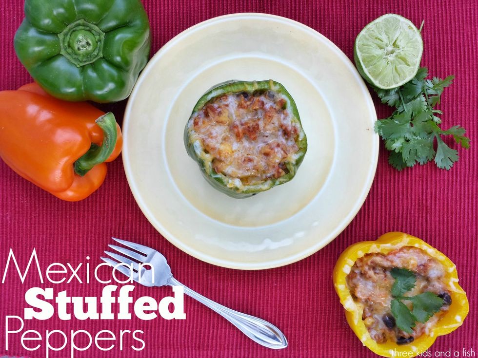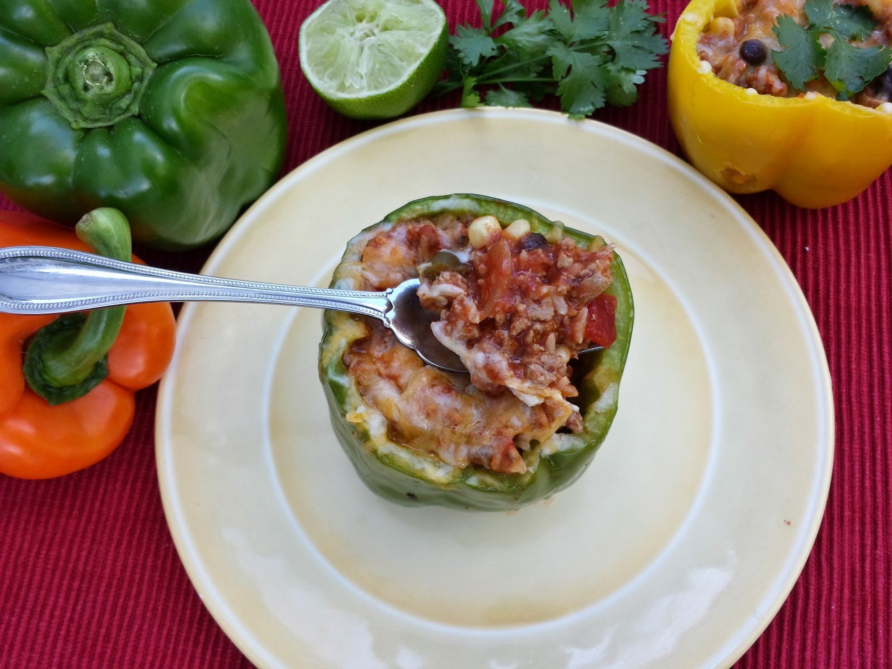 Our family loves all different types of Mexican food and we decided to take those great flavors and create Mexican stuffed peppers! These colorful peppers are stuffed with seasoned ground turkey, salsa, rice, corn, black beans and Mexican cheese! The pepper makes a nice edible bowl that holds in all the great flavor. We serve these Mexican stuffed peppers alongside warm tortillas that we use to roll some of the filling inside!