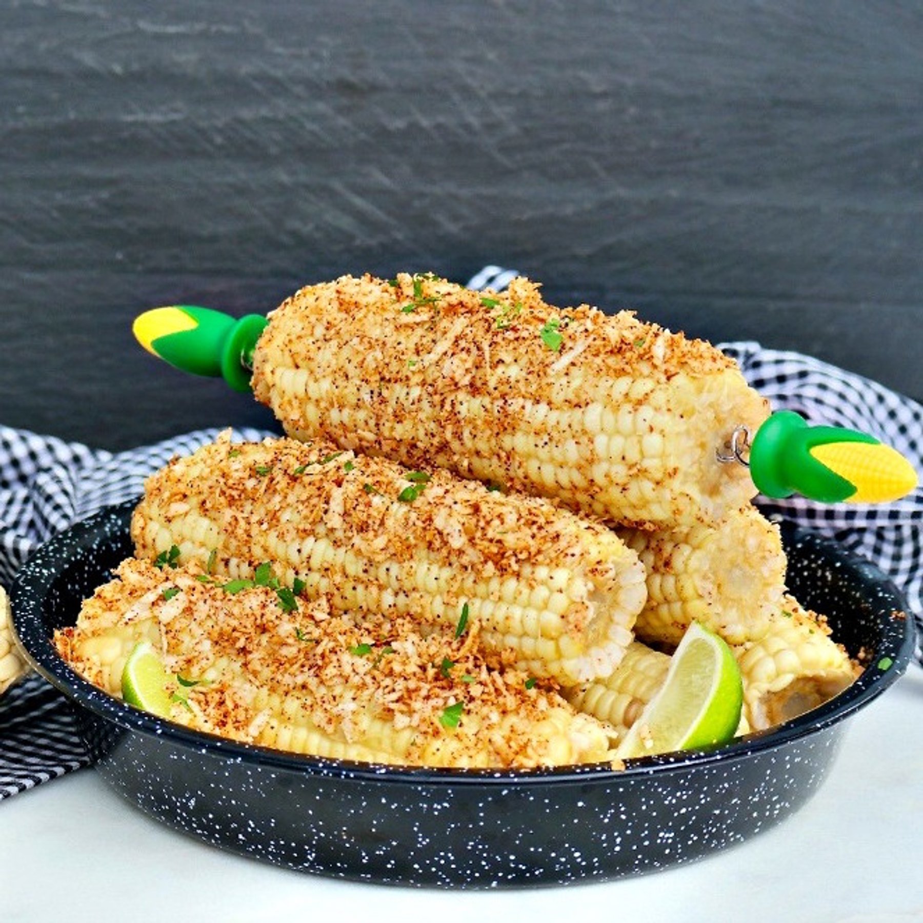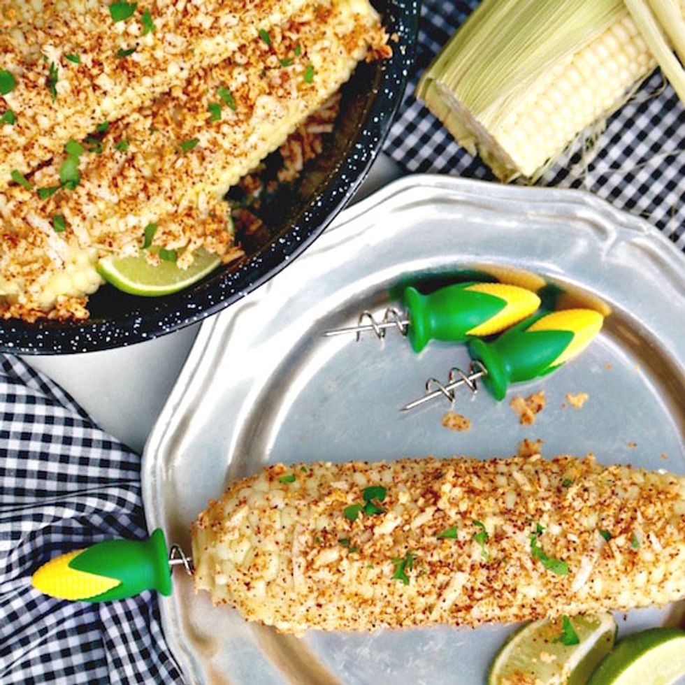 Cob topped with plenty of melted butter, chili powder, cotija cheese, salt and fresh lime juice. Serve at picnics or BBQ parties