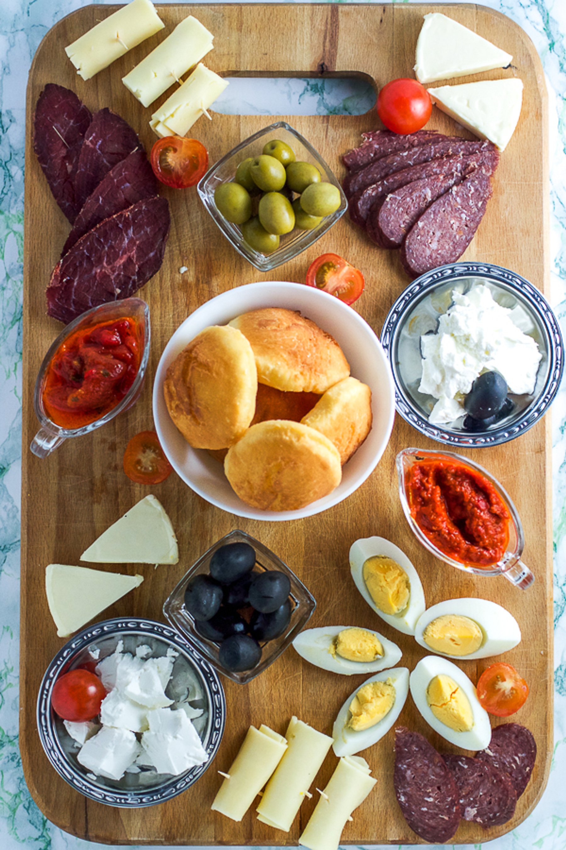 An easy way to put together an appetizer platter Balkan style. Also known as meza in the area, this type of snack platter is typical to what you may encounter on your visit to someone’s home.