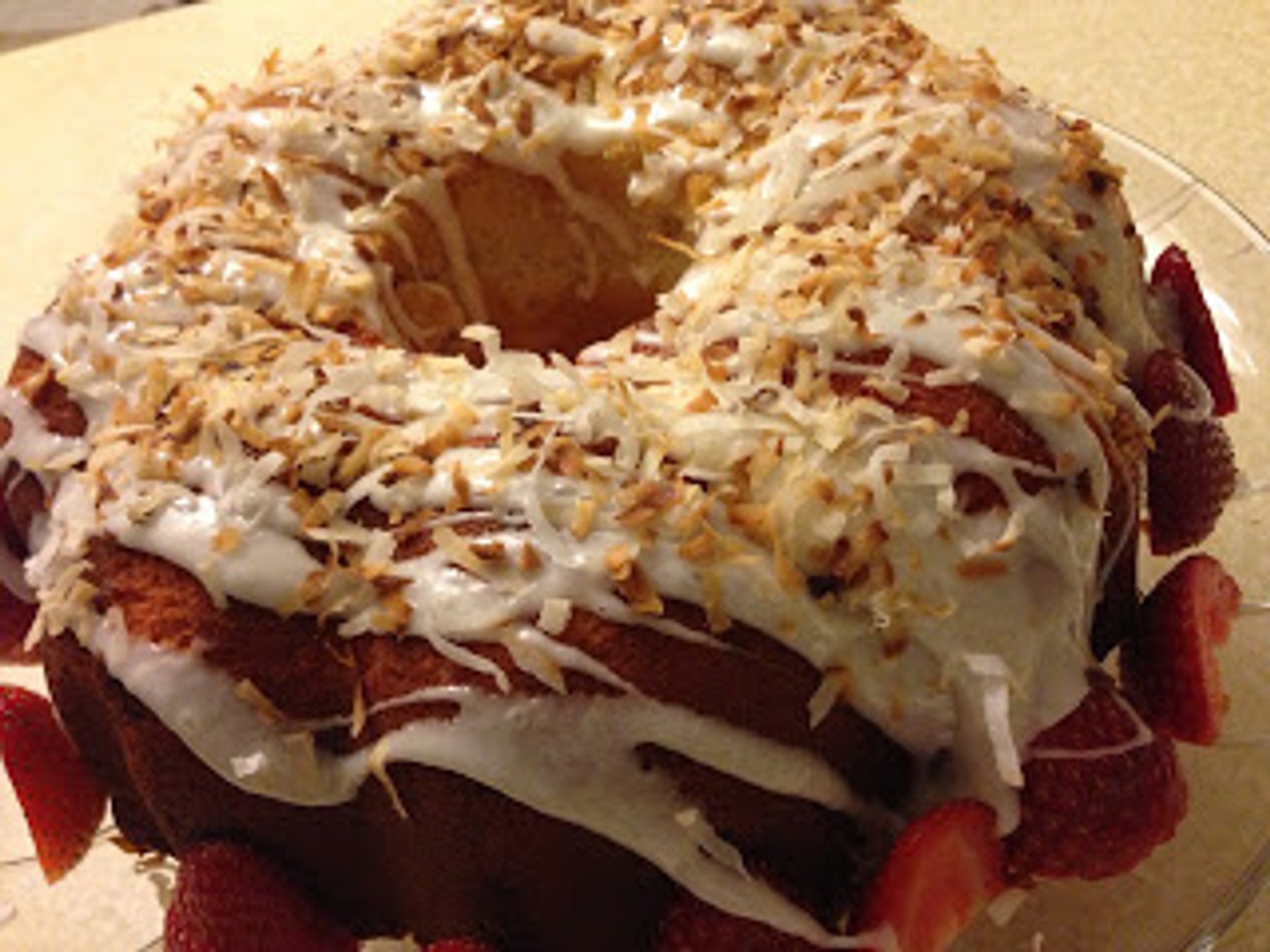 Miami Vice Bundt Cake with Cream of Coconut Glaze and Toasted Coconuts