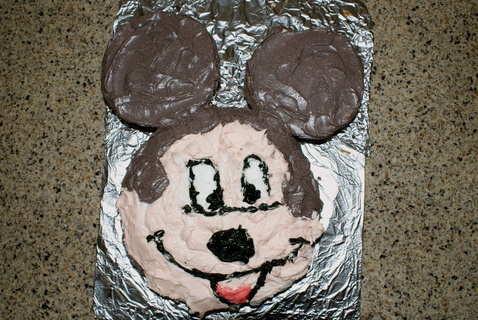 Put the cake pieces together to create Mickey's face. Crumb coat the entire cake. Use a toothpick and draw the outline of mickeys face (his eyes, mouth, nose, etc.) and let set in refrigerator.