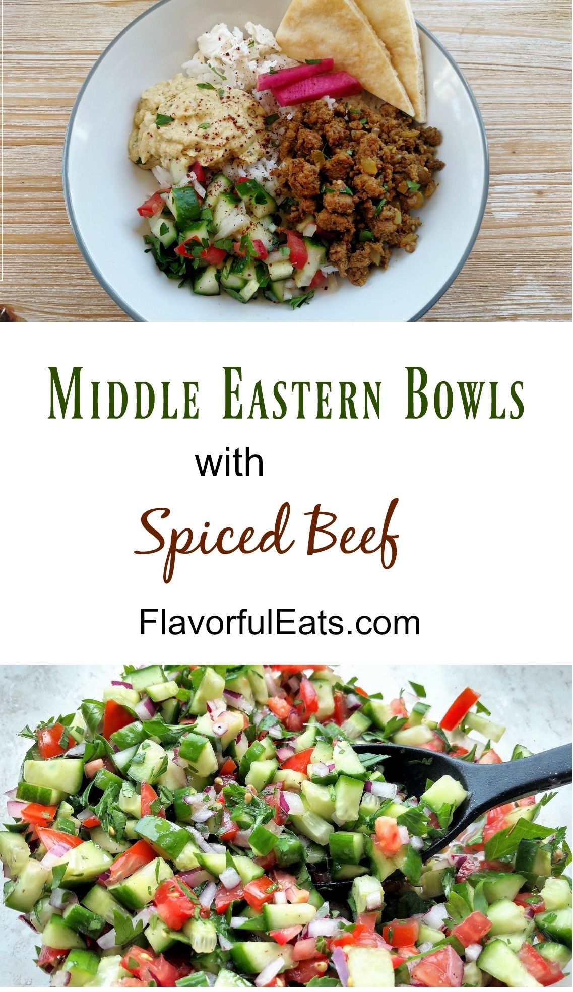 Middle Eastern Bowls with Spiced Beef have all your favorite Middle Eastern favorites like hummus, rice, salad shirazi, and ground beef seasoned with warm Middle Eastern spices all in one delectable bowl.