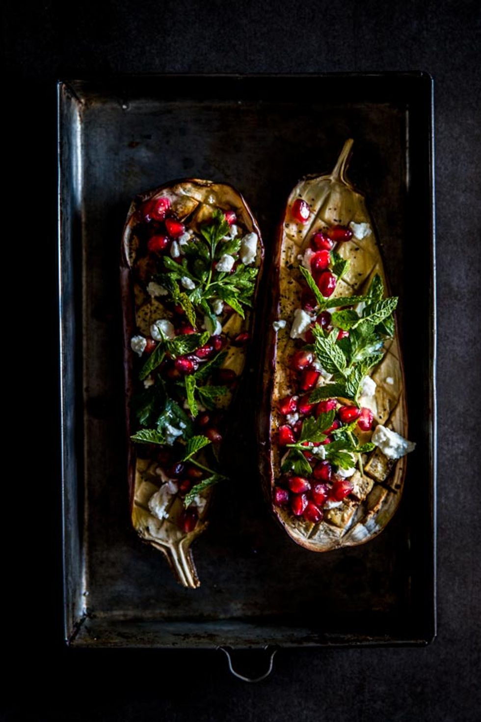 Heat the oven to 450°F (230°C). Halve the aubergines lengthwise (it is fine to leave the green top on for looks, however don't eat it) and cut the flesh in a criss-cross pattern.