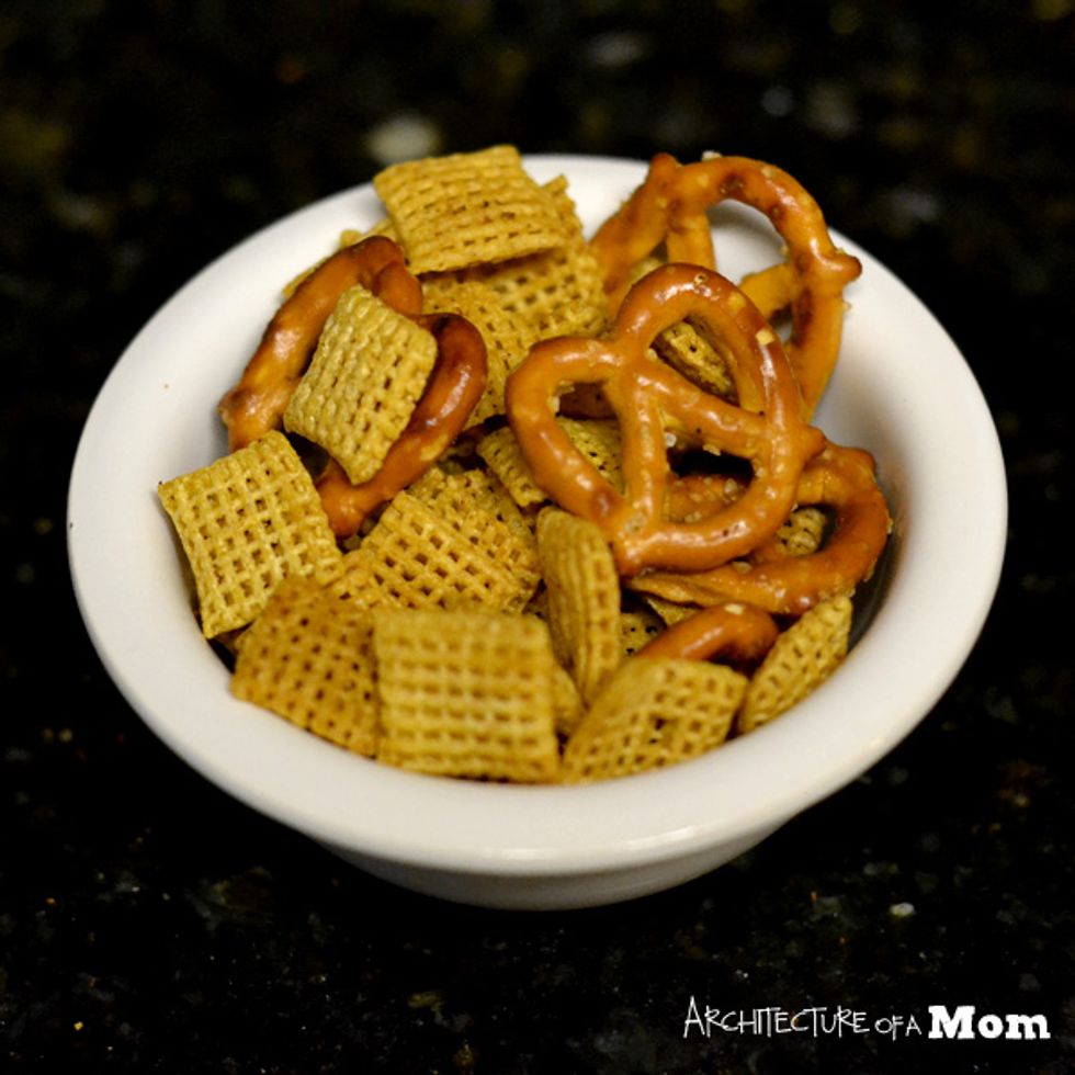 I know that this holiday season, our family will be taking some car rides that will require snacks along the way. And I hate premade snacks for the little ones for many reasons, and one is the amount of salt in them. Forget the health concerns...if the snacks are too salty, then they'll drink too much, and then we'll have to stop for more potty breaks, and no one wants to drag a car ride out longer than necessary. That is why I started experimenting with making my own version of Chex