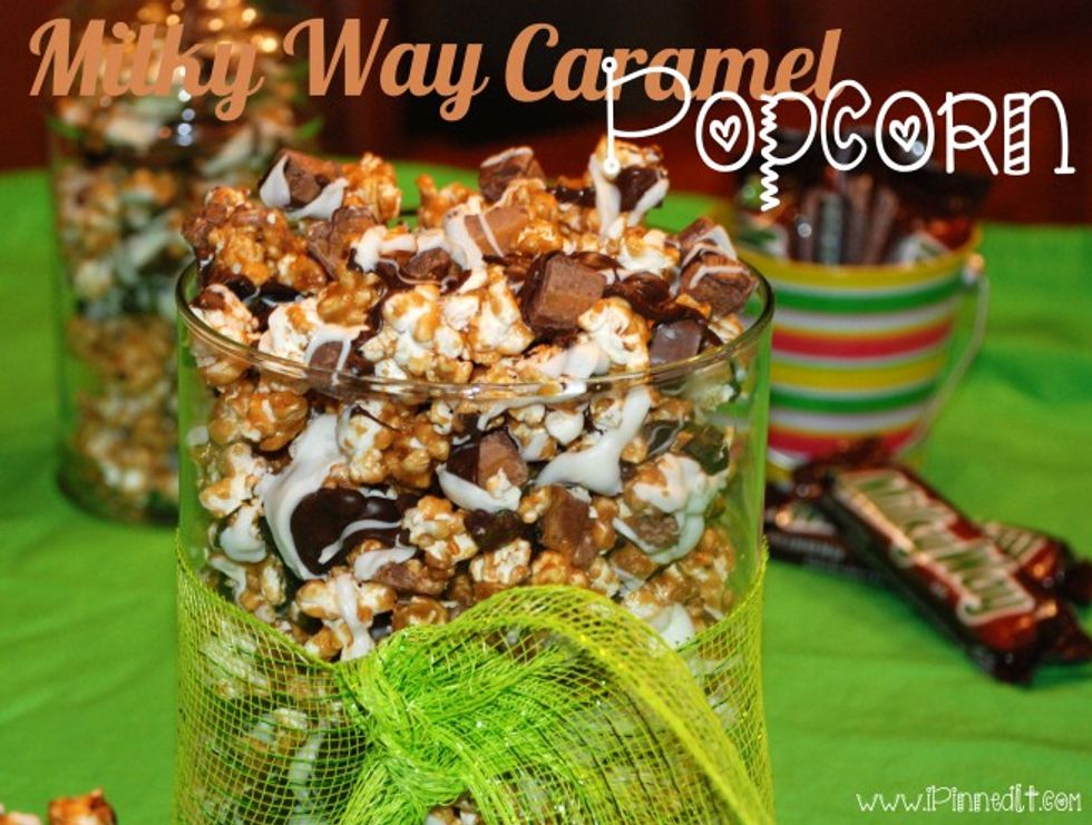 Incredibly delicious and decadent caramel popcorn drizzled with white and milk chocolate and infused with one of the best candy bars evah--Milky Ways! YEOW! This crunchy snack is the perfect complement to your movie night!
