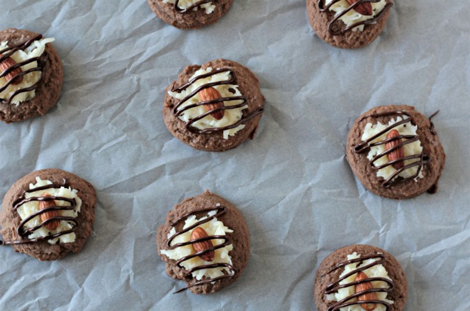 Almond Joy Cookies feature a light and fluffy chocolate cookie baked to perfection, topped with sweet gooey coconut candy then drizzled with chocolate.