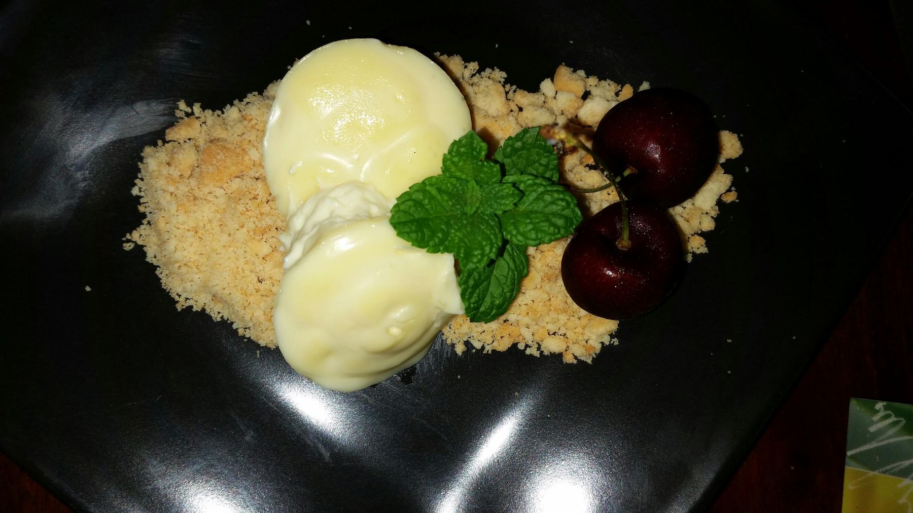 On you small serving plates spread a little of the biscuit mix with a spoon to form a small line. Place the cheesecake into the middle and garnish with cherries and mint,