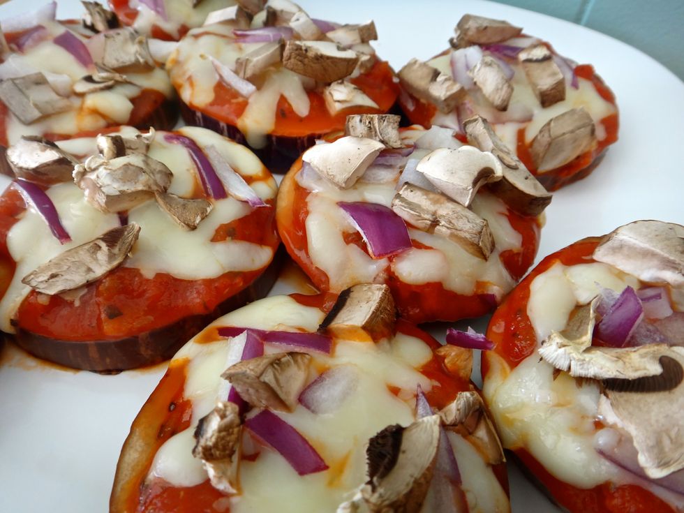 Put your eggplant rounds on a baking sheet and top with dollops of marinara sauce. Next, top with the grated mozzarella and whichever toppings you are choosing to use.