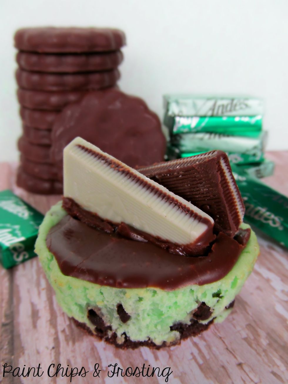 Decadent mint chocolate chip cheesecake baked with a grasshopper cookie as crust, topped with chocolate ganache and Andes candies.