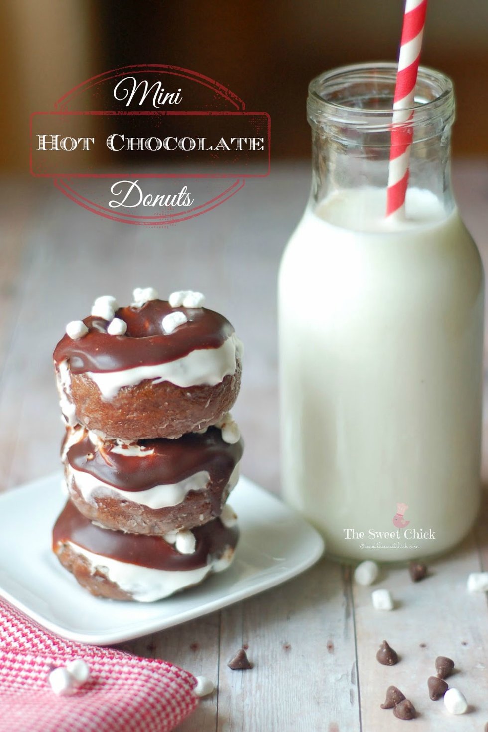 Mini baked donuts made with hot cocoa mix, and topped with a marshmallow and chocolate frosting.