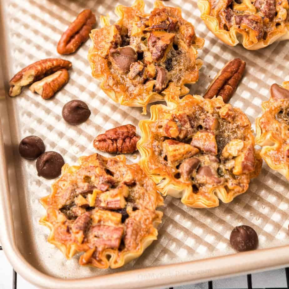 Tender, flakey mini pecan chocolate pie bites are the perfect two-bite dessert. Great for party trays and perfect for Thanksgiving, these deliciously buttery easy mini pecan pies make the best sweet treat! This easy recipe has all the flavors you love about traditional pecan pie in a little bite and is perfect for the holiday season.