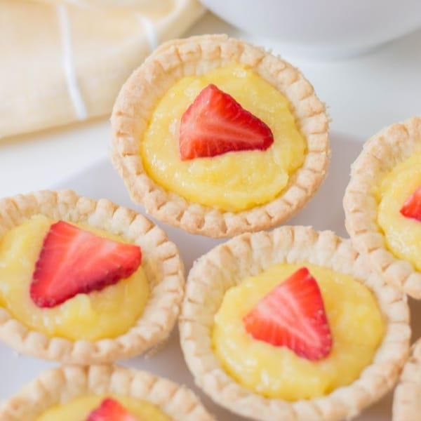 "Mini Strawberry Lemon Tarts are a bright and flavorful spring dessert. This easy dessert recipe uses mini pie shells to save you time in the kitchen. If you have never had a lemon tart you have been missing out! Lemon tarts are sweet and tart and very lemony. If you like lemon bars you will probably adore lemon tarts! These lemon tarts are single serving and are perfect on a platter for parties. This is a simple recipe to double or triple for a crowd."