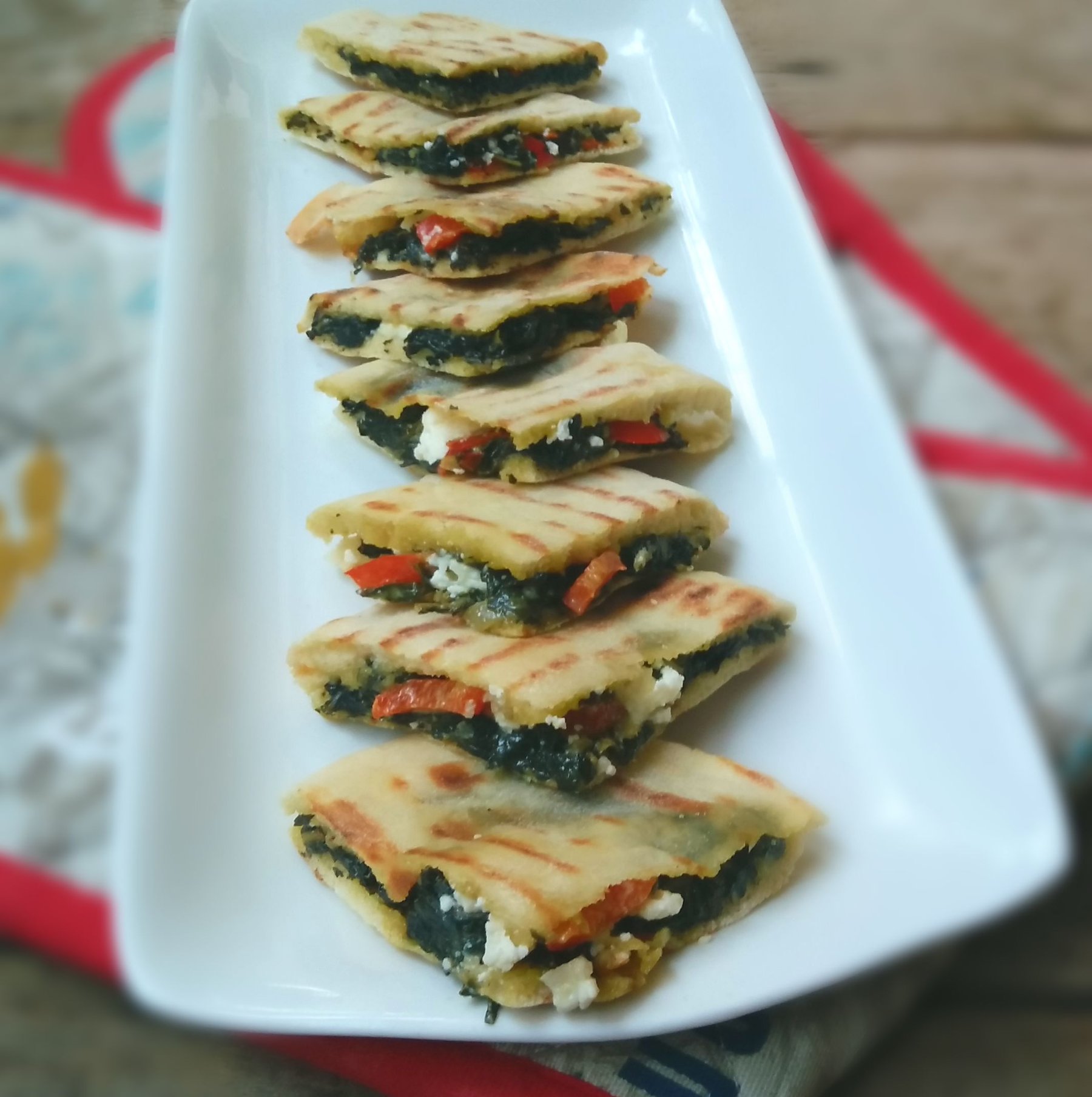Mini Tramezzini with Creamed Spinach, Feta and Sweet Pepper are one bite little triangular sandwiches. This is also a great vegetarian snack option.
