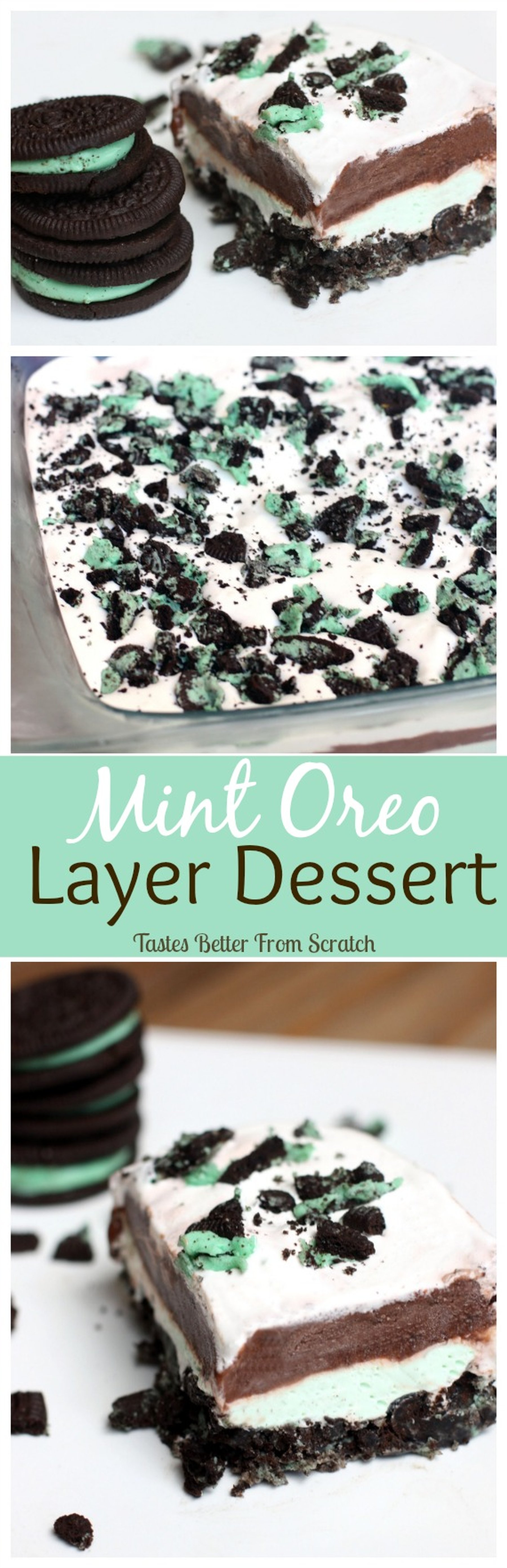 An easy no-bake dessert with layers of mint Oreos, cream cheese, chocolate pudding and Cool Whip!