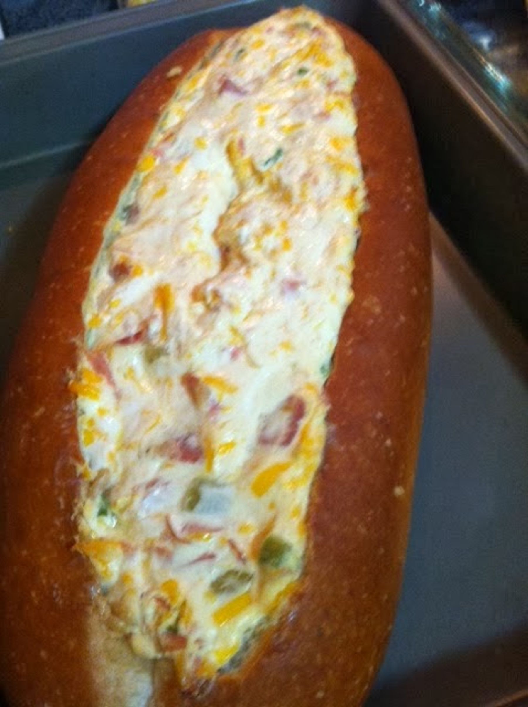 In a mixing bowl, combine all ingredients, except French bread; stirring until well blended.
