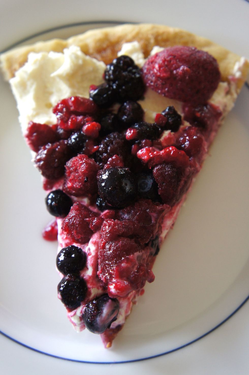 Pizza for breakfast with mascarpone cheese and mixed berries, absolutely delicious.