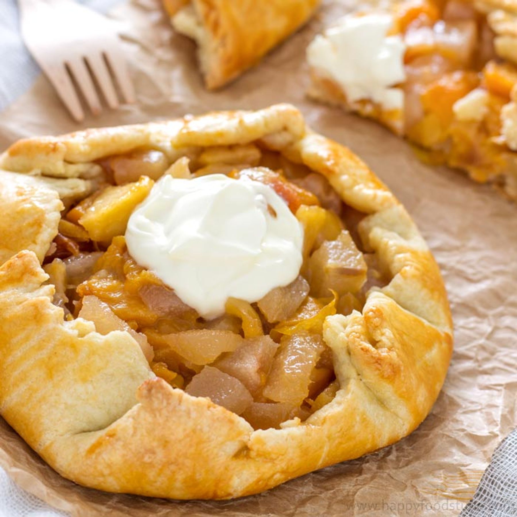 Wash, peel, core and dice the fruit. In a pan, melt butter and sugar. Add the fruit and reduce the heat to medium. Cook for about 5 minutes. Turn off and let it cool. Meanwhile: Roll out the pastry into a...