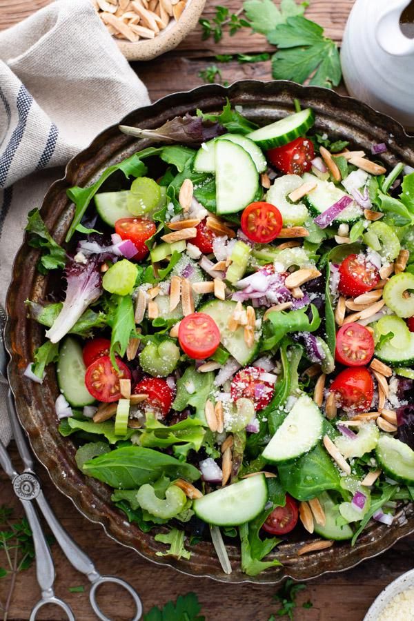 A restaurant-worthy mixed green salad that you can make at home, any night of the week! You'll love the combination of crisp lettuce, salted, toasted almonds, tomatoes, cucumbers, celery, red onion and Parmesan cheese in a quick and zippy homemade red wine vinaigrette dressing. Serve the salad as a side dish with grilled salmon, pizza, steak, or a classic lasagna. Alternatively, turn the salad into an entrée by topping it with meat or seafood and pairing it with a side of crusty baguette. It's fresh, delicious and full of flavor!