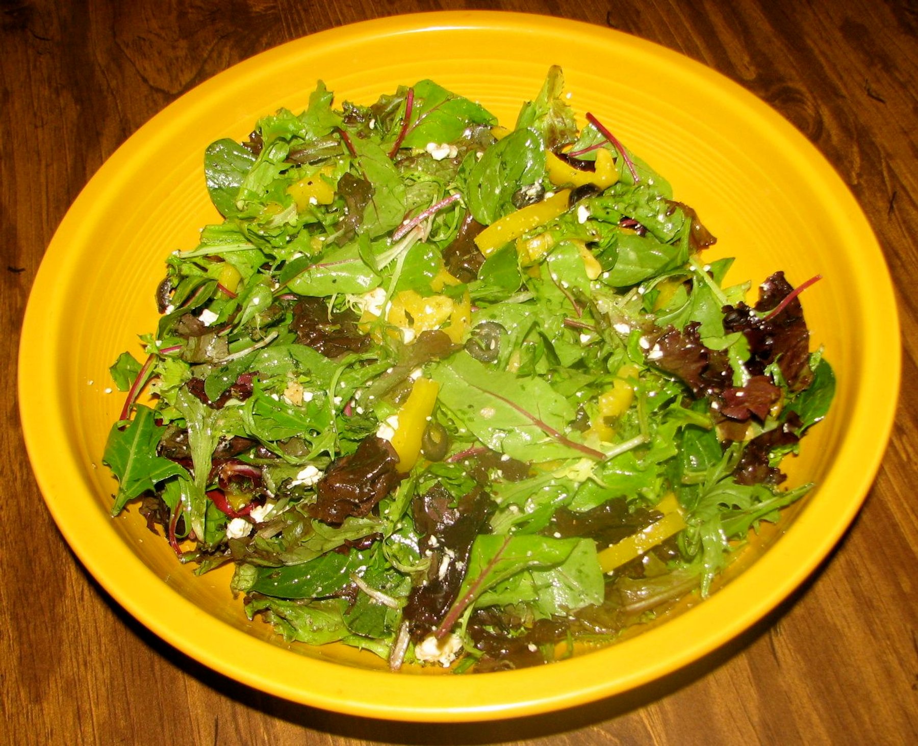 Place the salad greens, bell pepper, olives and feta cheese in a large bowl and set aside. For the vinaigrette combine the olive oil, sherry vinegar, oregano, garlic, salt and pepper in a bowl with a tight...