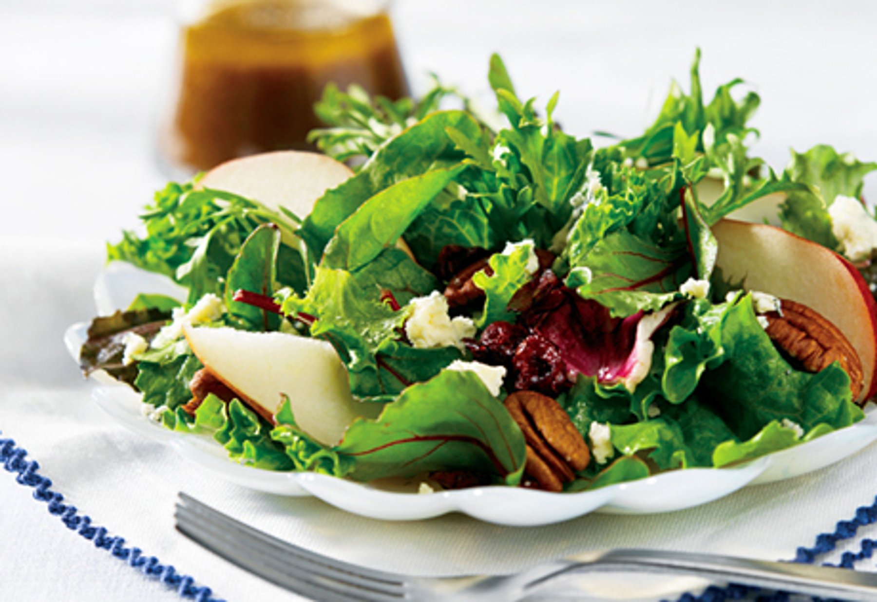 When you're looking for a show-stopping salad, try our unique and delicious warm dressing that tops mixed baby greens, fresh and dried fruits, toasted pecans and crumbled blue cheese.