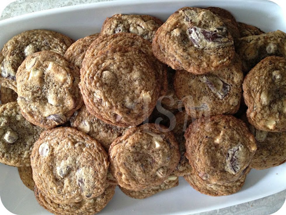 A buttery cookie base with a hint of coffee notes and studded with milk, white, and dark chocolate chunks.