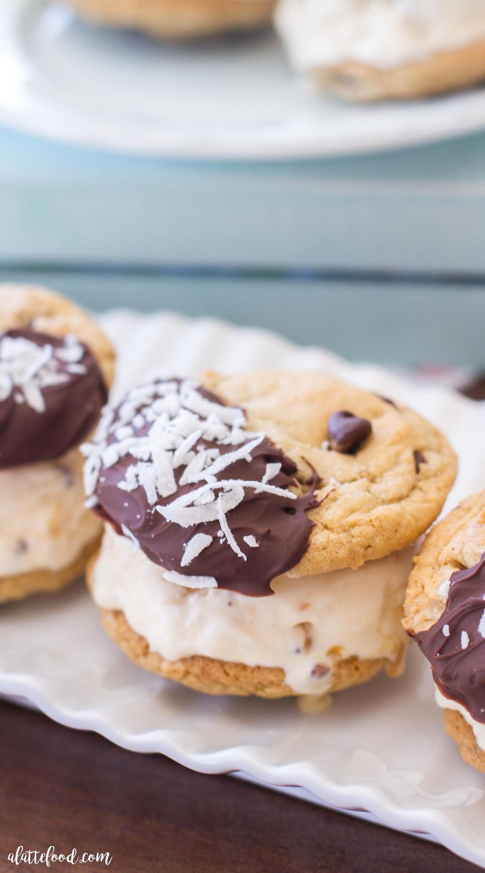 Mocha Coconut Chocolate Chip Cookies are dipped in chocolate, sprinkled with coconut, and perfect when sandwiched around rich caramel ice cream!